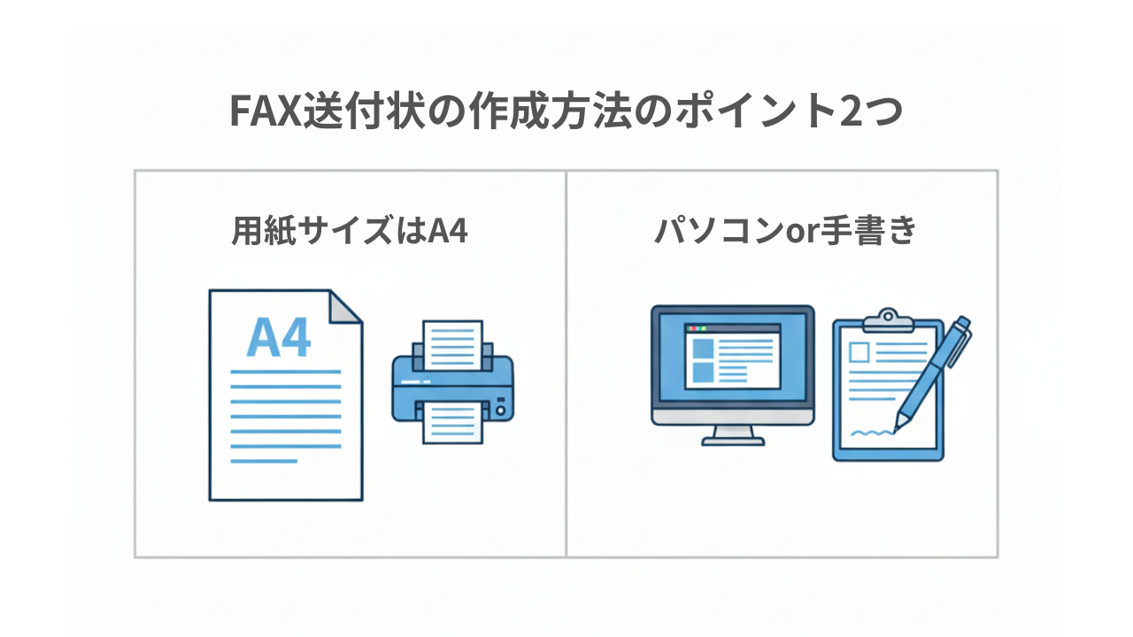 FAX送付状はサイズや書き方が決まっているわけではありません。しかし、一般的にA4サイズで作成されることが多くなっています。また作成はパソコンでも手書きでも可能です。FAX送付状の基本的な作成方法について、以下の2点に絞ってポイントを解説します。