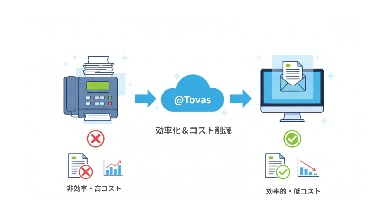 コクヨの電子帳票配信システム『@Tovas』は、請求書や納品書などの帳票書類を電子化して送付できるクラウドサービスです。従来のFAXよりも送信スピードが格段に速く、ペーパーレス化も実現できます。帳票書類の送付にかかる業務負担を軽減できるため、ぜひご利用ください。