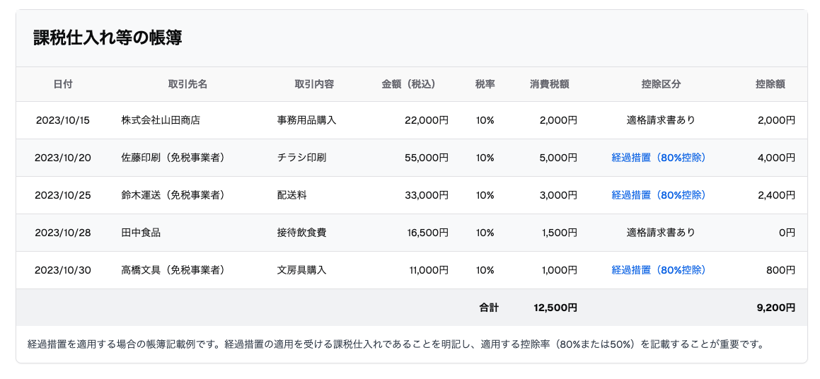 経過措置の適用を受ける場合、通常の記載事項に加えて、「経過措置の適用を受ける課税仕入れである旨」を帳簿に明記する必要があります。具体的な記載例(例「80%控除」など)を社内で統一すると管理しやすくなります。