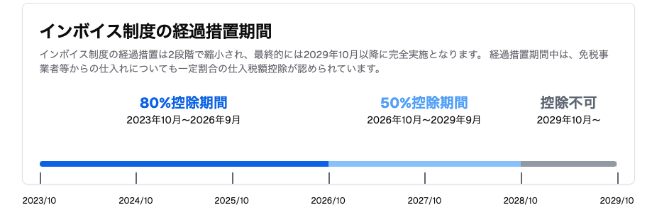 経過措置により、免税事業者等からの課税仕入れについて、段階的に控除割合が引き下げられます。2029年10月以降は控除ができなくなるため、計画的な対応が必要です。