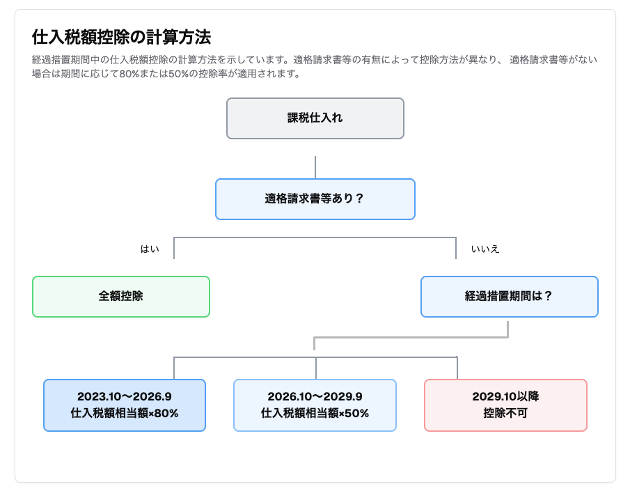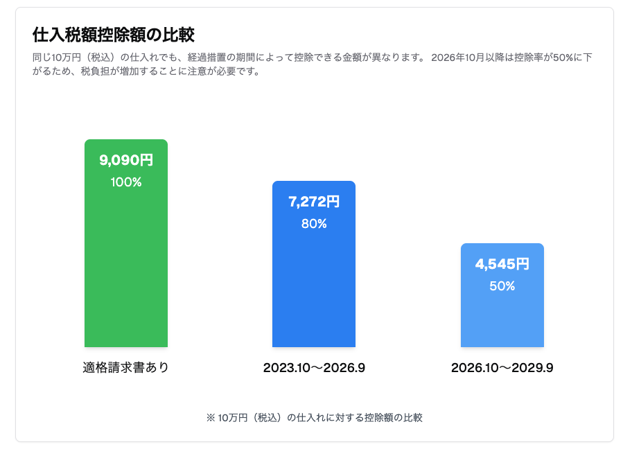 A2 課税仕入れを行った日(請求書の日付ではなく、商品やサービスの提供を受けた日)が属する期間で判定します。例えば、2026年9月30日に仕入れを行った場合は80%控除、2026年10月1日に仕入れを行った場合は50%控除となります。
