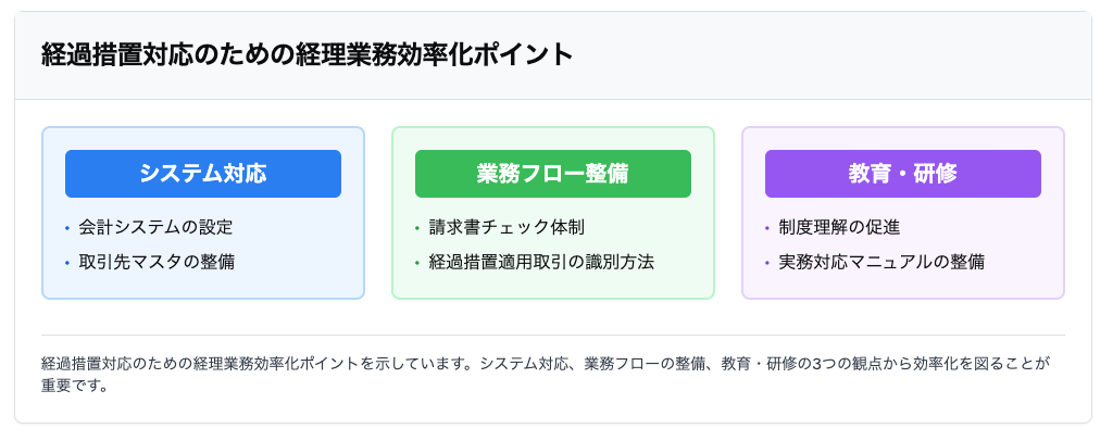 経過措置対応のための経理業務効率化ポイントを示しています。システム対応、業務フローの整備、教育・研修の3つの観点から効率化を図ることが重要です。