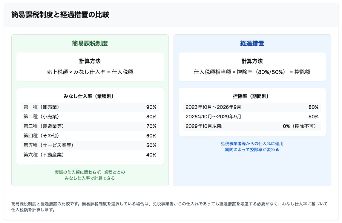 簡易課税制度を選択している事業者は、売上にかかる消費税額に業種ごとに定められた「みなし仕入率」を乗じて仕入税額控除額を計算します。個々の取引についてインボイスの保存や仕入税額の積上げ計算は行わないため、簡易課税選択者は経過措置の影響を受けません。
