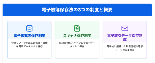 電子帳簿保存法は「電子帳簿等保存」「スキャナ保存」「電子取引」の3つの区分に分かれます。特に「電子取引」データの電子保存は2024年から全ての事業者で義務化されている点に注意が必要です。