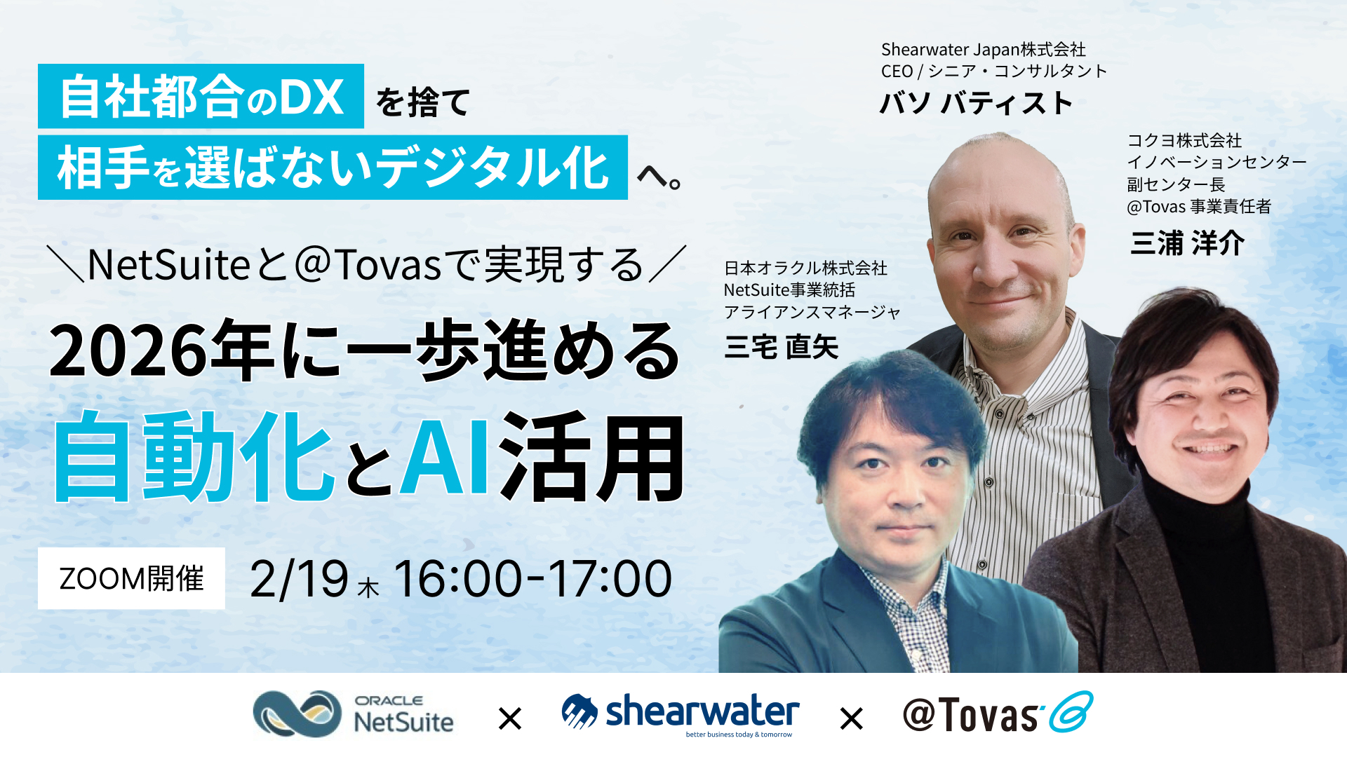 | 内容 | 【登壇者紹介】 ■Shearwater Japan株式会社 CEO / シニア・コンサルタント バソ バティスト 伊藤忠商事、Airbus Japan、VeritasPartnersなどで、コンサルティング、ファイナンス、M&A、システム導入といった複合的な業務経験を積む。 2012年よりShearwater Japan(シャーウォータージャパン)株式会社の代表取締役社長に就任。これまでに数十社の提案・導入コンサルタントとして企業の業務改善・改革を主導。特に多拠点・多通貨環境下での複雑な経営課題の解決に強みを持つ。国内外で100を超えるプロジェクト実績と豊富なファイナンス業務経験に基づき、机上の空論ではない、現場に即した「統合型経営基盤」の現実的な知見を提供します。 ■日本オラクル株式会社 NetSuite事業統括 アライアンスマネージャ 三宅 直矢 1995年日本オラクル入社後、証券系SEを経験。2007年以降は国内外IT企業でチャネル営業やアライアンスマネージャーとしてパートナービジネスに従事。 米国企業ではデータ分析、IoT、RPA、ERP製品に携わる。デモ開発、製品ハンズオントレーニング、セミナー企画、協同営業活動など技術者兼パートナー営業として活動を行う。 2025年より日本オラクルNetSuite事業統括でアライアンスマネージャとしてSaaS連携情報作成や共同企画など幅広く担当。SDNプログラムの日本における窓口。 ■コクヨ株式会社 イノベーションセンター 副センター長 @Tovas 事業責任者 三浦 洋介 大学卒業後、大手独立系SIerに入社。システムエンジニアとしてソフトウェアの企画・開発、各業界のシステム構築を経て、 2007年にコクヨ株式会社R&D部門に入社。コクヨ発の帳票配信クラウド「@Tovas(あっととばす)」の事業責任者としてサービス開発や販売チャネル開拓など事業を牽引。2019年4月より経営企画部門にて将来の姿や社会の変化を見据えながらコクヨの長期ビジョンの策定を担当。 2021年に新設されたイノベーションセンターにて新規ビジネスの創出と探索を行っている。 |